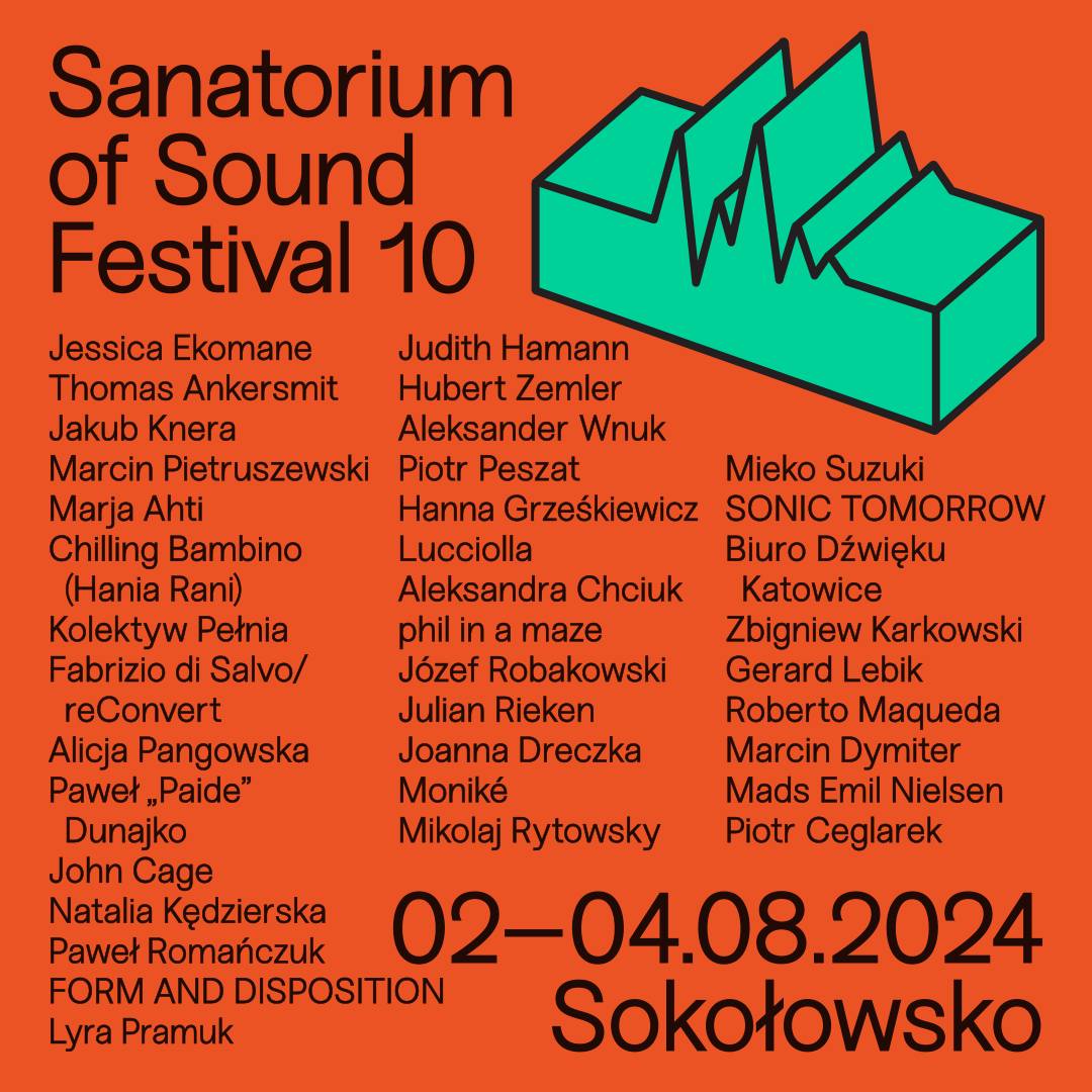 We will hear and see sound works by such artists as Jessica Ekomane, Chilling Bambino (Hania Rani), Thomas Ankersmit, Lyra Pramuk, Marcin Pietruszewski, Marja Ahti, Kolektyw Pełnia (Aleksandra Chciuk, Joanna Dreczka, Alicja Pangowska, Natalia Kędzierska), John Cage, Mieko Suzuki, Józef Robakowski, Judith Hamann, Paweł Romańczuk, SONIC TOMORROW (Hanna Grześkiewicz, Julian Rieken), Hubert Zemler, Jakub Knera, FORM AND DISPOSITION (Aleksander Wnuk, Piotr Peszat, Zbigniew Karkowski), Lucciolla, phil in a maze, Fabrizio di Salvo/reConvert (Roberto Maqueda, Mikolaj Rytowsky), Gerard Lebik, Paweł „Paide” Dunajko, Biuro Dźwięku Katowice (Mads Emil Nielsen, Moniké, Marcin Dymiter, Piotr Ceglarek).